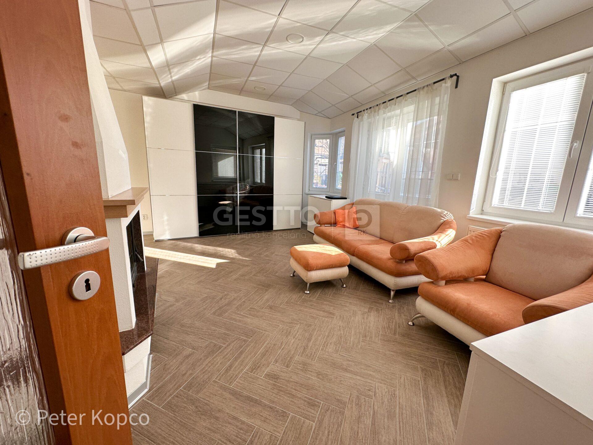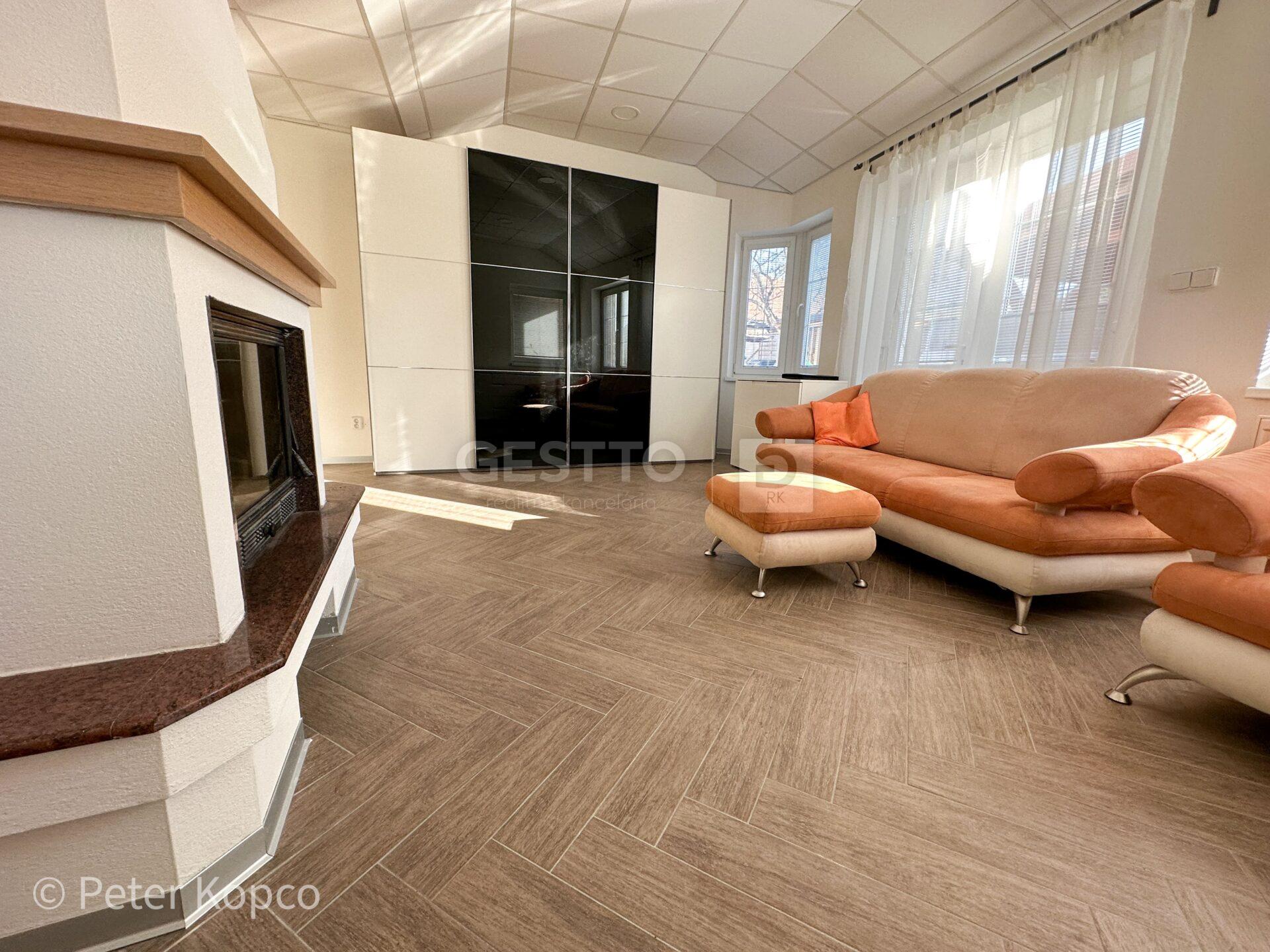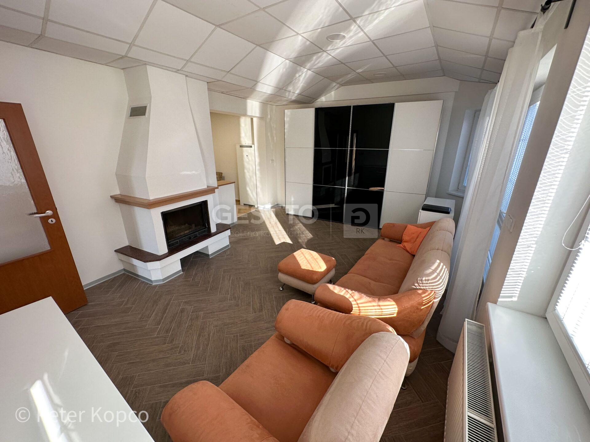 -v rámci obývacej miestnosti sa nachádza krb na tuhé palivo (primárne sa kúri prostredníctvom panelových radiátorov), sedacia súprava, úložný a odkladací priestor, klimatizácia