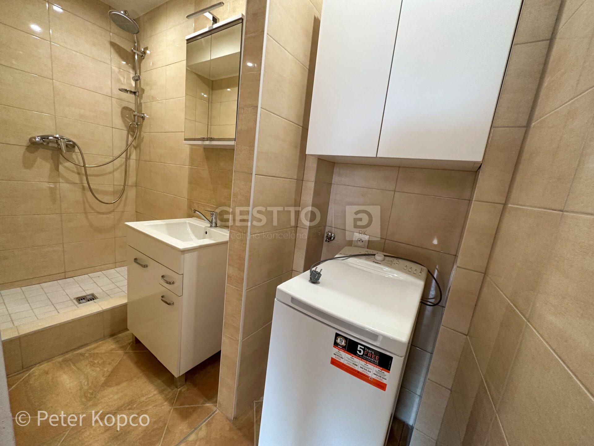 -kúpeľňa so sprchovacím kútom a práčkou na bielizeň